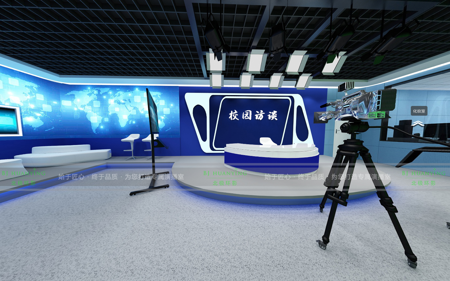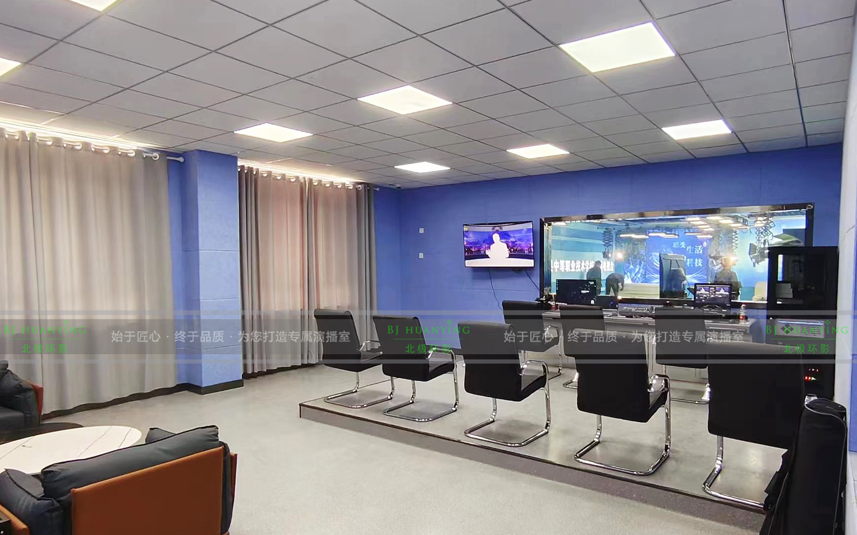 整个演播室按功能划分为虚拟演播区、实景座谈区、“校园访谈”栏目区、控制室。该校园电视台设计是集新闻制作、电视访谈、个人演讲、微课制作等节目为一体的专业类综合校园电视台。校园电视台的技术先进性、安全性和环境美学三大要素的整合统一,是该项目整体建设过程中优先考虑的因素;同时兼顾性能价格比,基于上述思考,新疆洛浦中等职业学校精品校园电视台应运而生。该项目占地面积140平米,施工周期30天。