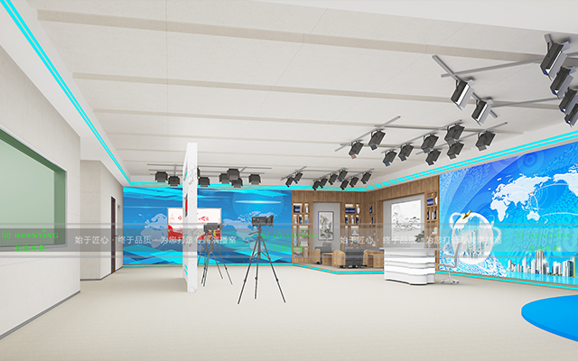 整个演播室功能全面,划分为播报区,座谈区,站播区,虚拟区,导播区几大区域,为用户提供了无限的创作和创意空间,满足客户多场景应用需求。该项目占地面积约140平米,施工周期2个月。