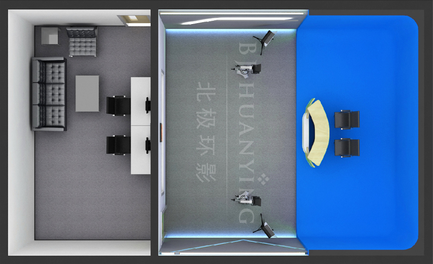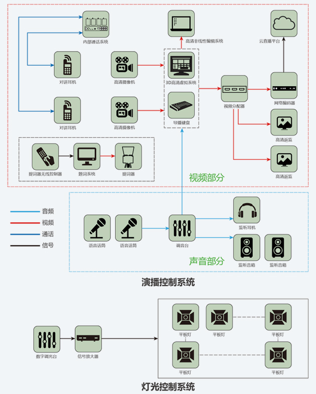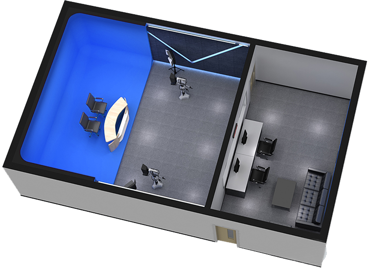 虚拟演播室系统组成按功能分为视频、音频、虚拟、通话、tally、蓝箱灯光等子系统。简单描述其工作流程为:在演播室搭建一个蓝箱替代实景演播区背,进行高均匀度的布光。摄像机拍摄主持人在蓝箱上的前景视频信号,并输入到虚拟演播系统主机中。同时摄像机跟踪系统采集到的摄像机运动参数被送到虚拟场景生成系统中,系统根据这些参数实时生成相应的虚拟场景,使背景与前景的空间关系保持一致。将前景信号进行色键处理,把蓝箱换成电脑制作的虚拟场景,再与前景掩膜合成后形成节目输出。这样,制作人员就可以在一场地、一台虚拟设备上分别制作多个不同风格的节目,且场景可以任意的修改。